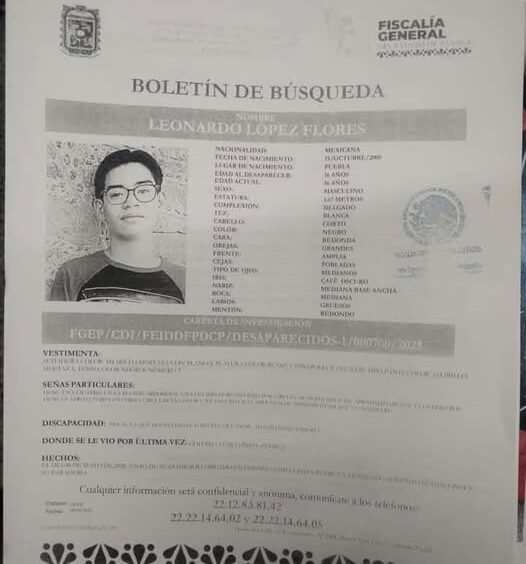#Periodico #Ayúdanos_a_compartir mayo 8, 2025 1 min read Se solicita su apoyo para localizar a Leonardo López Flores de 16 años de edad, quien se encuentra en calidad de desaparecido. Cualquier información, comuníquese al 2212838142 o al 911. Share: