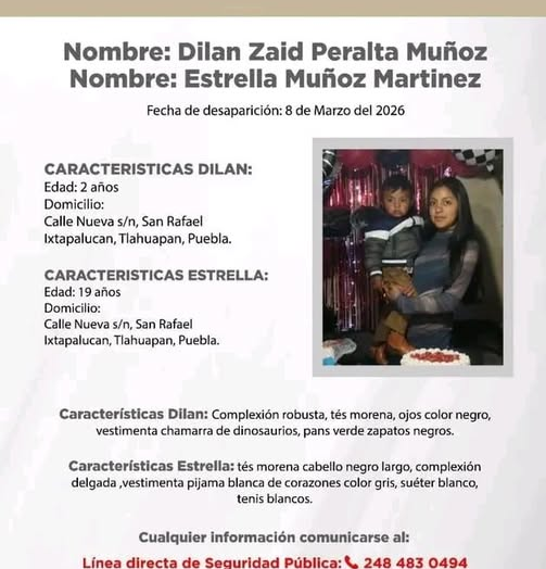 Se solicita el apoyo de la ciudadanía para localizar a Estrella Muñoz Martínez, de 19 años, y al menor Dilan Zaid Peralta Muñoz, de 2 años, reportados como desaparecidos el 8 de marzo en San Rafael Ixtapalucan, en el municipio de Tlahuapan. Cualquier información comunicarse al 2484830494.