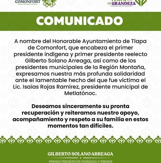 A nombre del Honorable Ayuntamiento de Tlapa de Comonfort, que encabezo, así como de los presidentes municipales de la Región Montaña, expresamos nuestra más profunda solidaridad ante el lamentable hecho del que fue víctima el Lic. Isaías Rojas Ramírez, presidente municipal de Metlatónoc. Deseamos sinceramente su pronta recuperación y reiteramos nuestro apoyo, acompañamiento y respeto […]