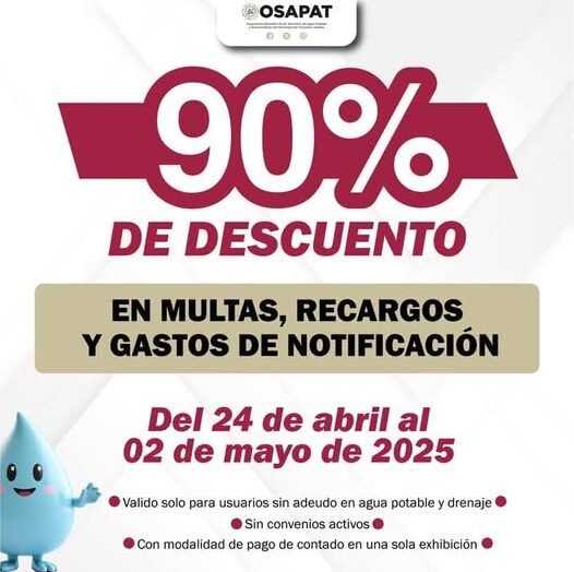 En OOSAPAT, nos preocupamos por el agua… y también por tu bolsillo. Con el objetivo de incentivar la regularización de multas lanzamos nuestra Campaña Escalonada de Descuentos en Multas, válida solo para usuarios sin adeudo en agua potable y drenaje, sin convenios activos y que realicen su pago en una sola exhibición. ¿Cómo funciona? Aprovecha […]