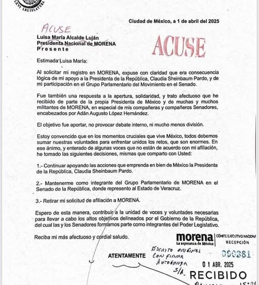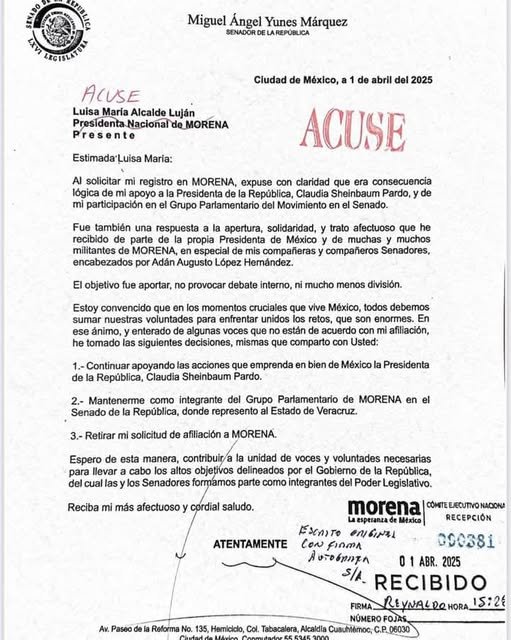 El Senador Miguel Ángel Yunez Márquez retiró su solicitud de registro como militante de #Morena, que ya entendió que hay una fuerte oposición para que sea parte del partido.