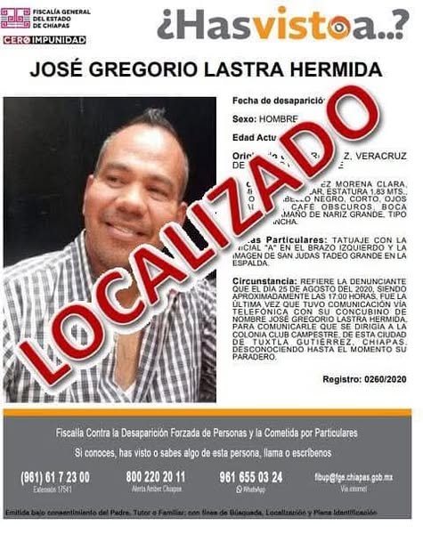 La Fiscalía de Chiapas publicó una ficha de búsqueda de J. G. Lastra H., en la descripción de los hechos se señala que la persona concubina lo reportó como desaparecido tras comunicarse con él por última vez a las 17:00 horas el 25 de agosto de 2020.