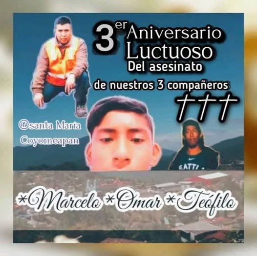 #Local no lo olvidamos. mayo 9, 2025 1 min read A 3 años del asesinato cobarde de nuestra gente de Santa María COYOMEAPAN. Share: